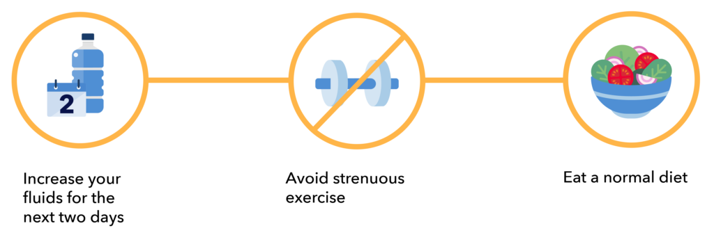 • Over the next 2 days, in addition to your regular water intake, drink at least four additional 8-oz servings.